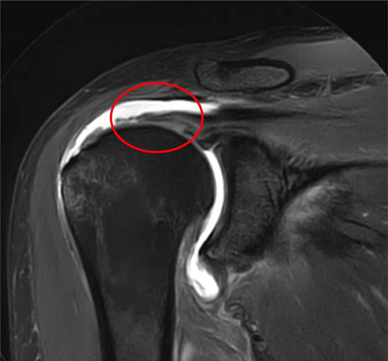 A-P view of a shoulder MRI with a Rotator Cuff Tear